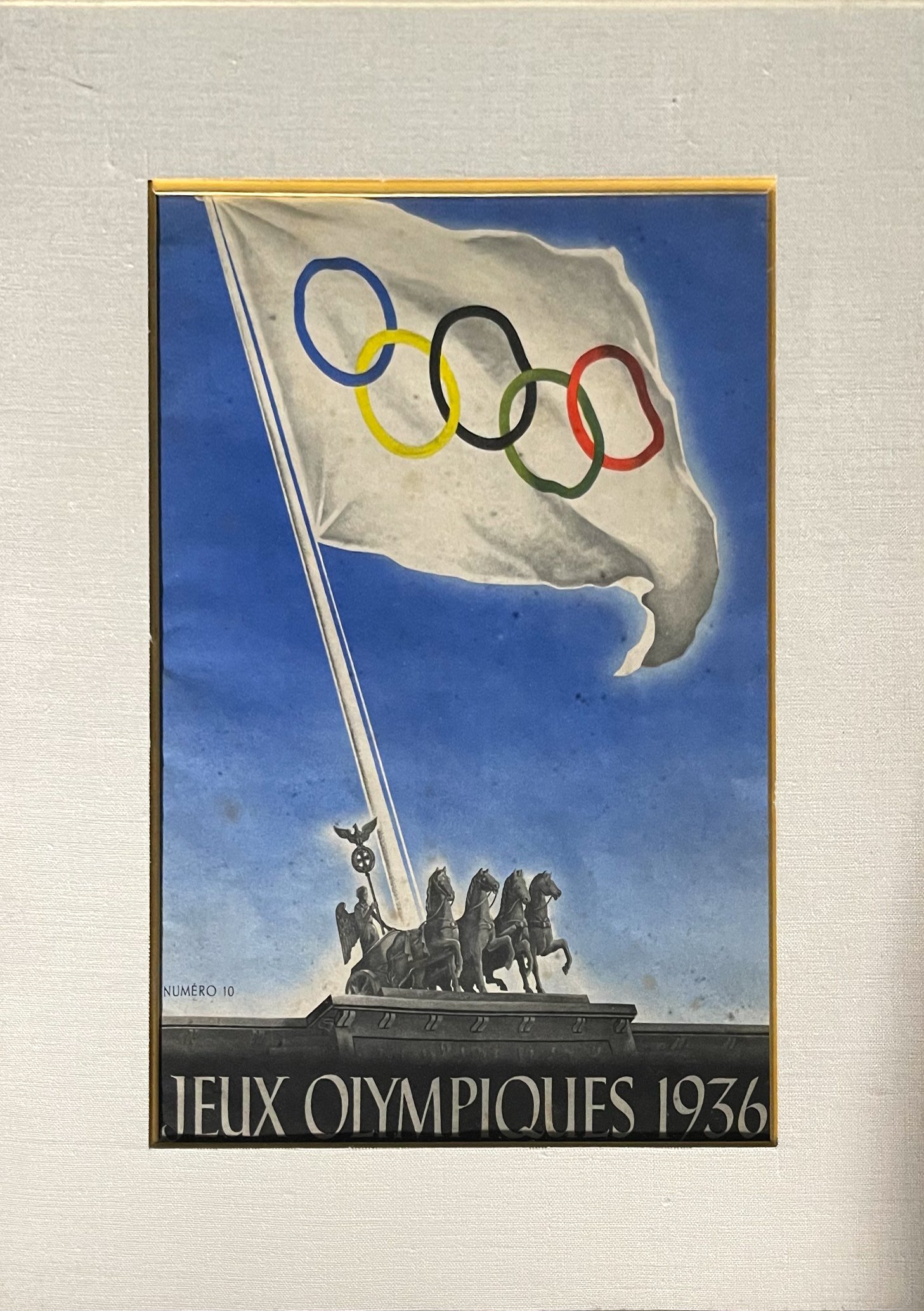 Classical influenced design by Franz Wurbel (b. 1897) featuring the image of the olympic flag flying over the triumphant Brandenburg Gate Quadriga (the four horses leading an ancient chariot sculpted by Johann Gottfried Schadow; 1764-1850)
